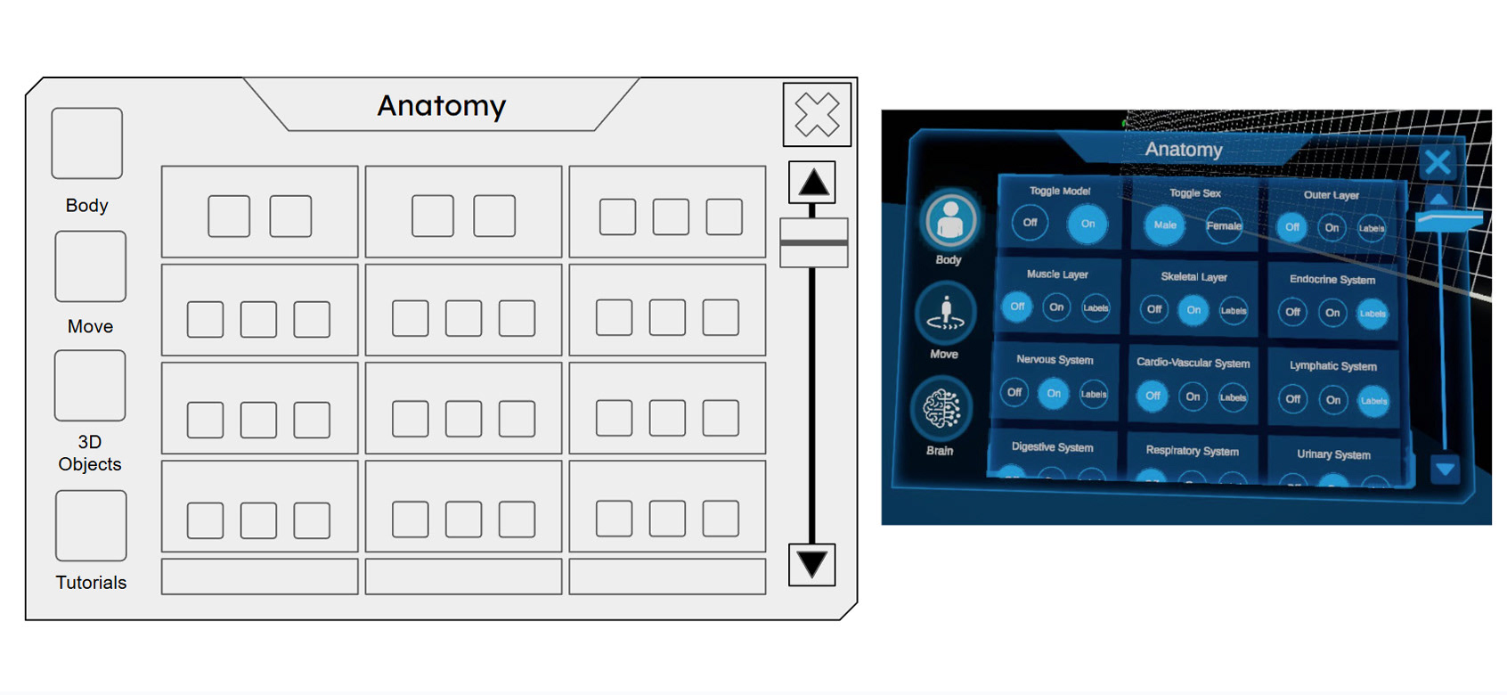 Decreased button scale by 20% and grouped anatomical systems logically to eliminate interface fatigue and optimize spatial usage within the VR headset.