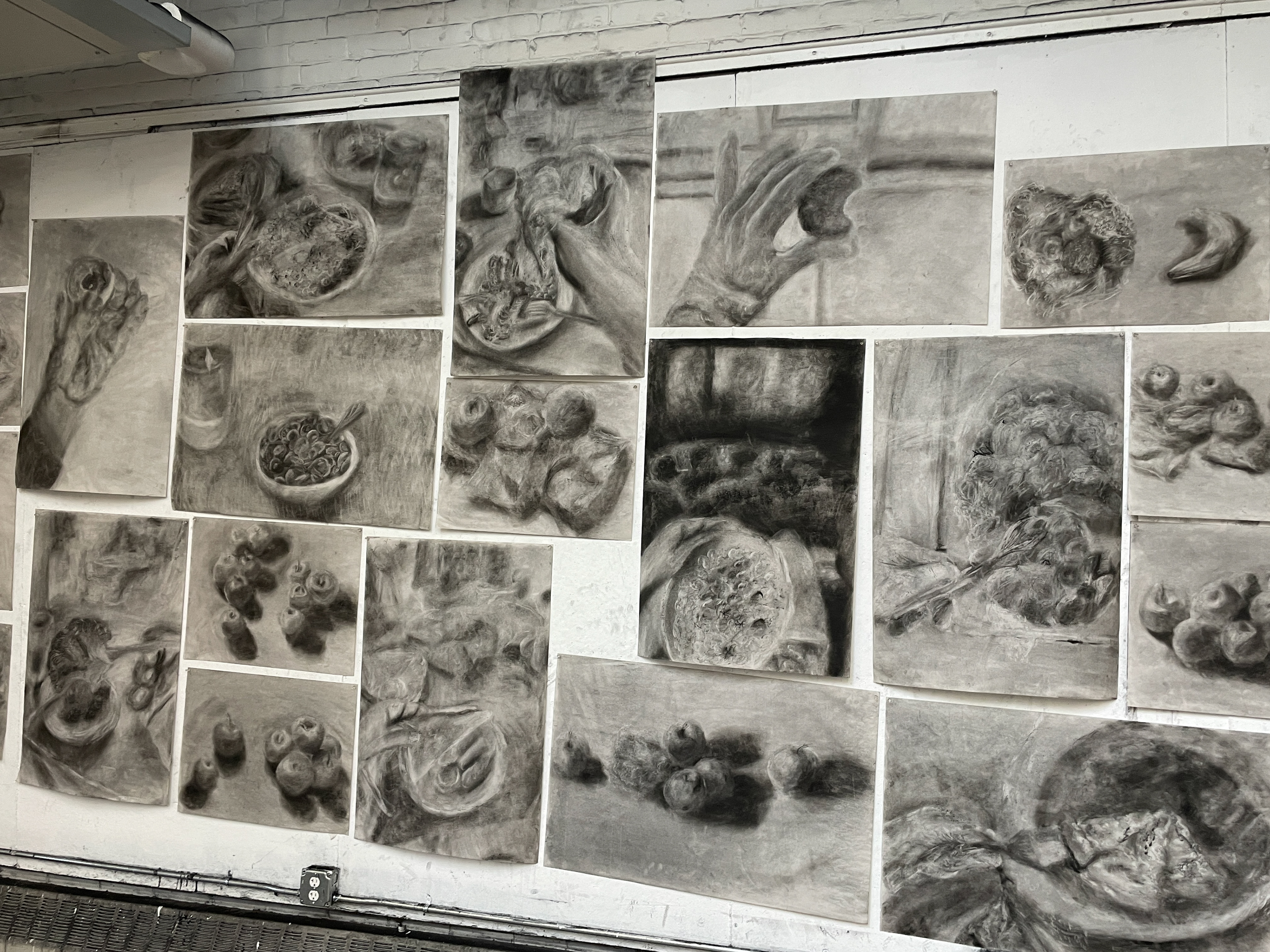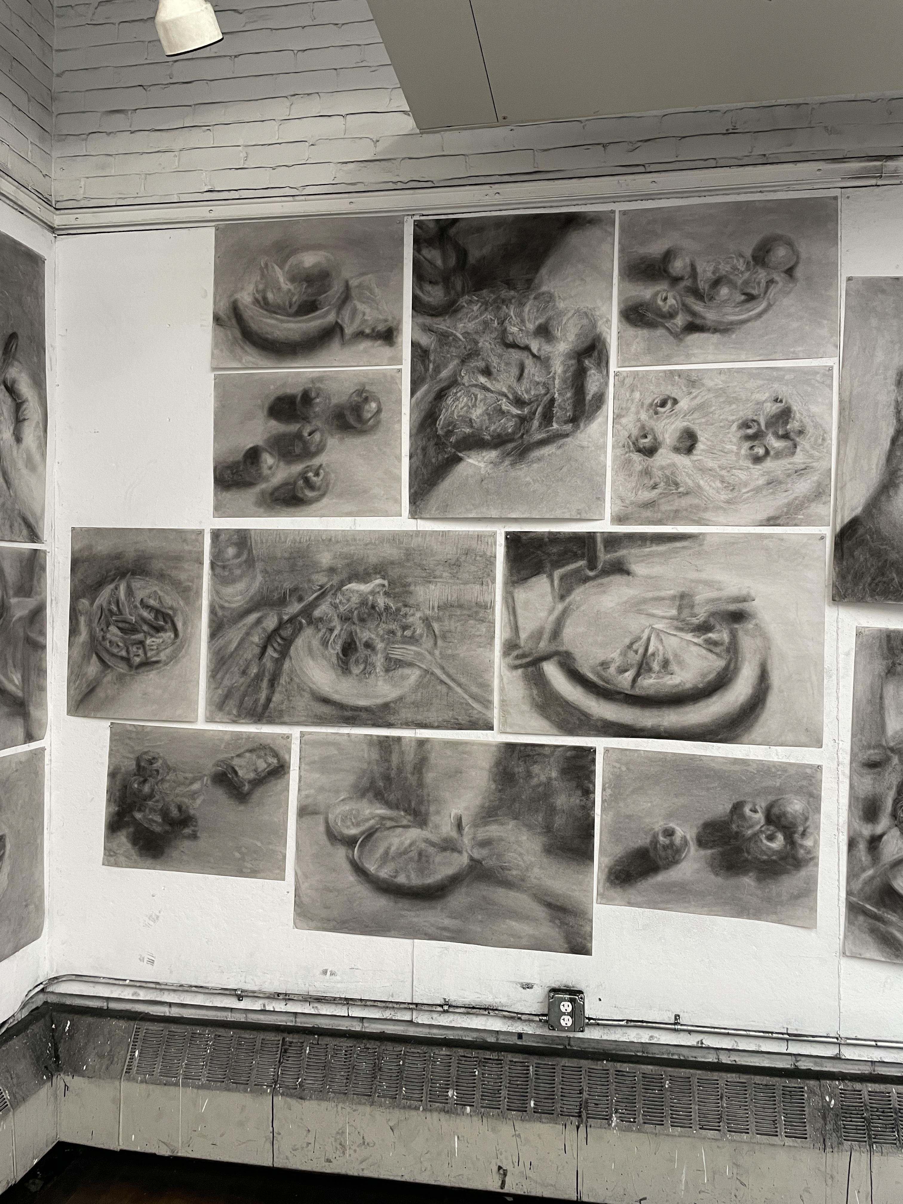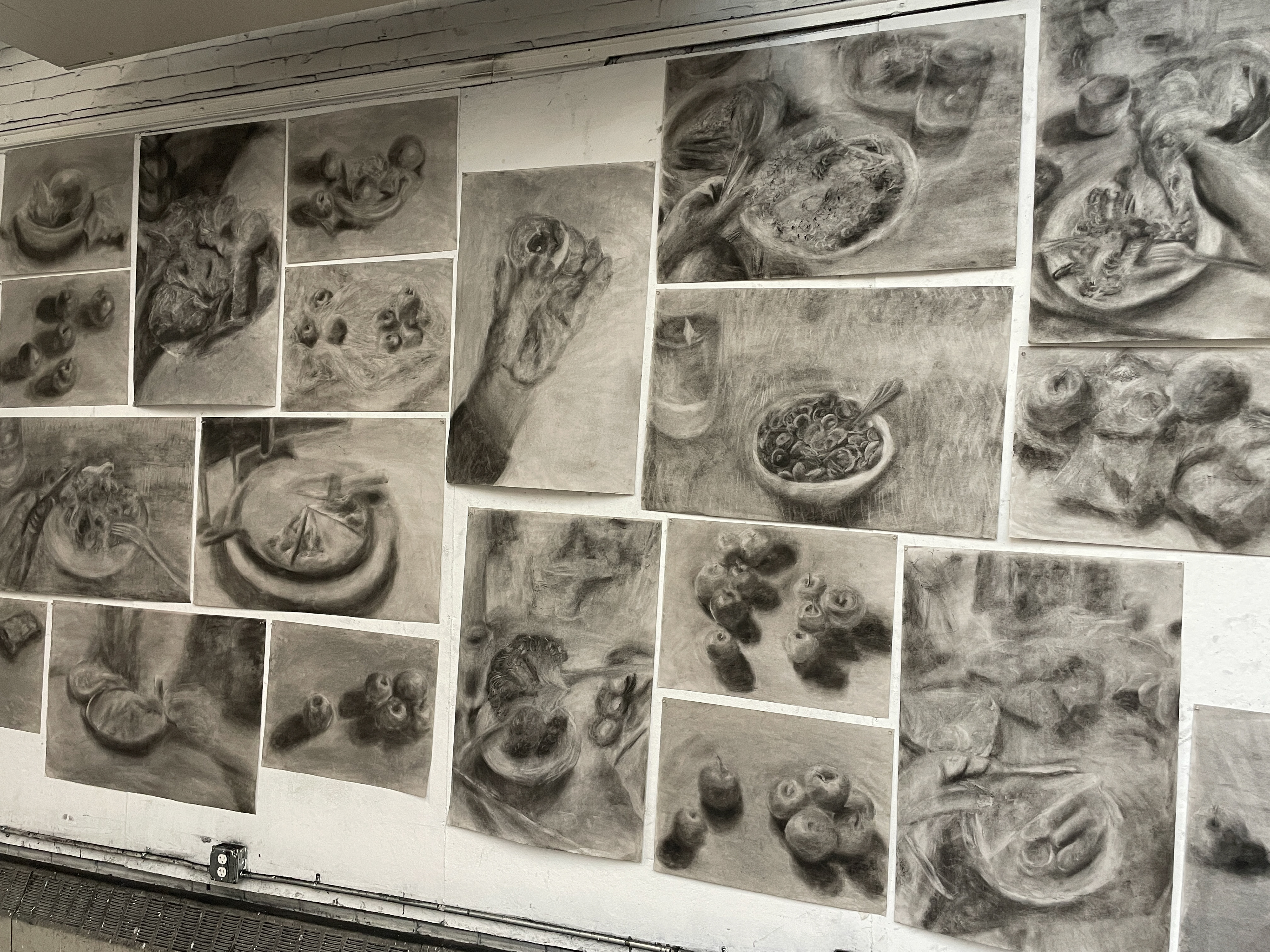 Food is essential to our human existence — and I wanted to explore the qualities that make it so appealing, tasty, yummy, sugary, or dry, gooey, and unsavory — the texture, flavor, and appearance. I wanted to continue challenging myself by combining light and shadow with line in a way that would convey these qualities. With time, I decided to do ever more ambitious and varied selections of food. I also took food to my room to draw in a different environment and was able to control the lighting and shadows of some of the meals I drew, such as many of the apple and fruit selections. One of the challenges I faced was the limits of charcoal, as drawing essentially in grayscale eliminated color, making some of the food ambiguous. To solve this, I chose less ambiguous appearing food or simplified the amount of food in the plate, leading to easier to recognize drawings. In the end, I was able to apply principles I learned in the course, such as variation in light and shadow, form, and the creation of an experience that would elicit feelings — qualities. This exploration made me learn about the diverse types of food and their often weird characteristics.