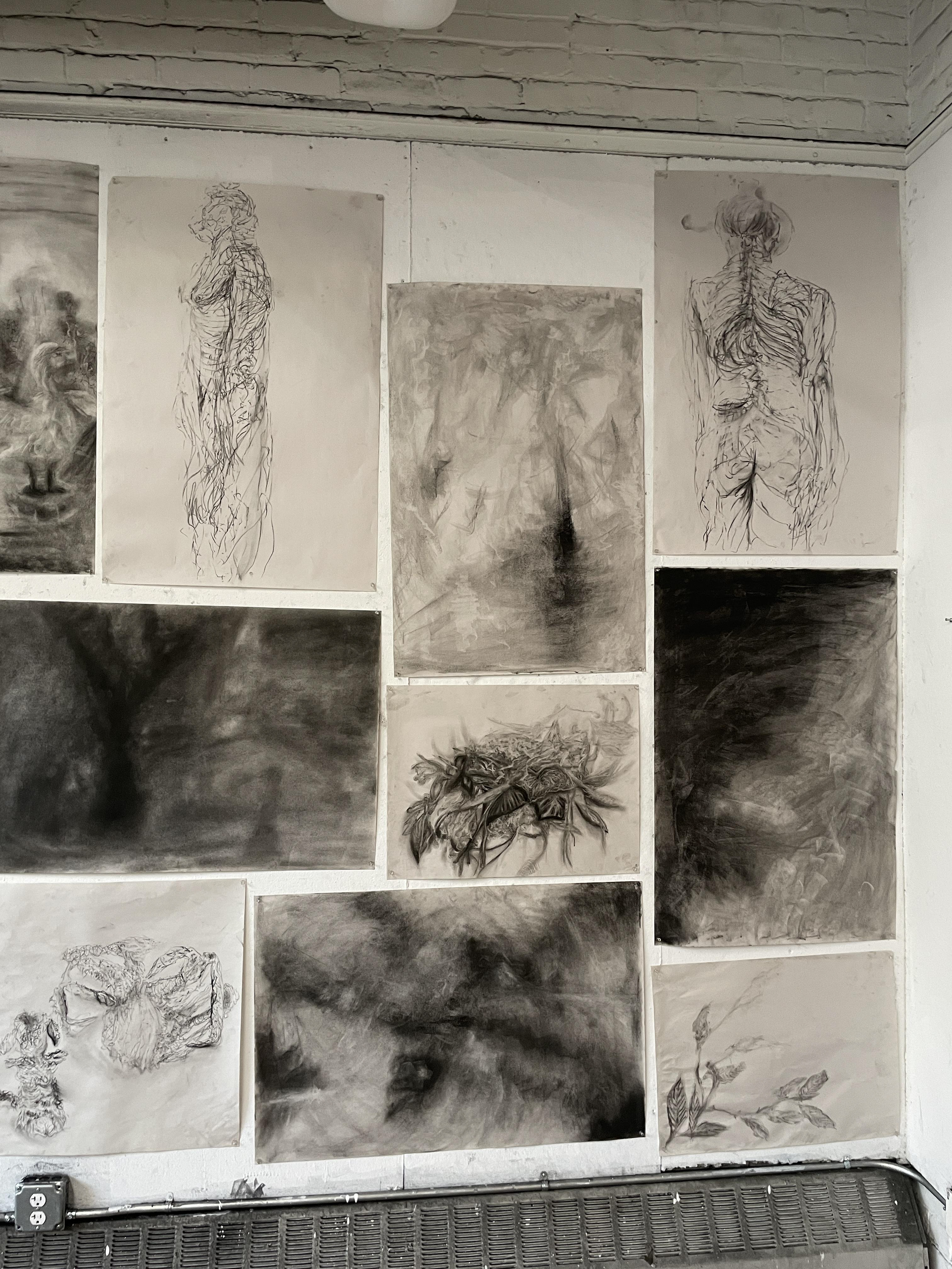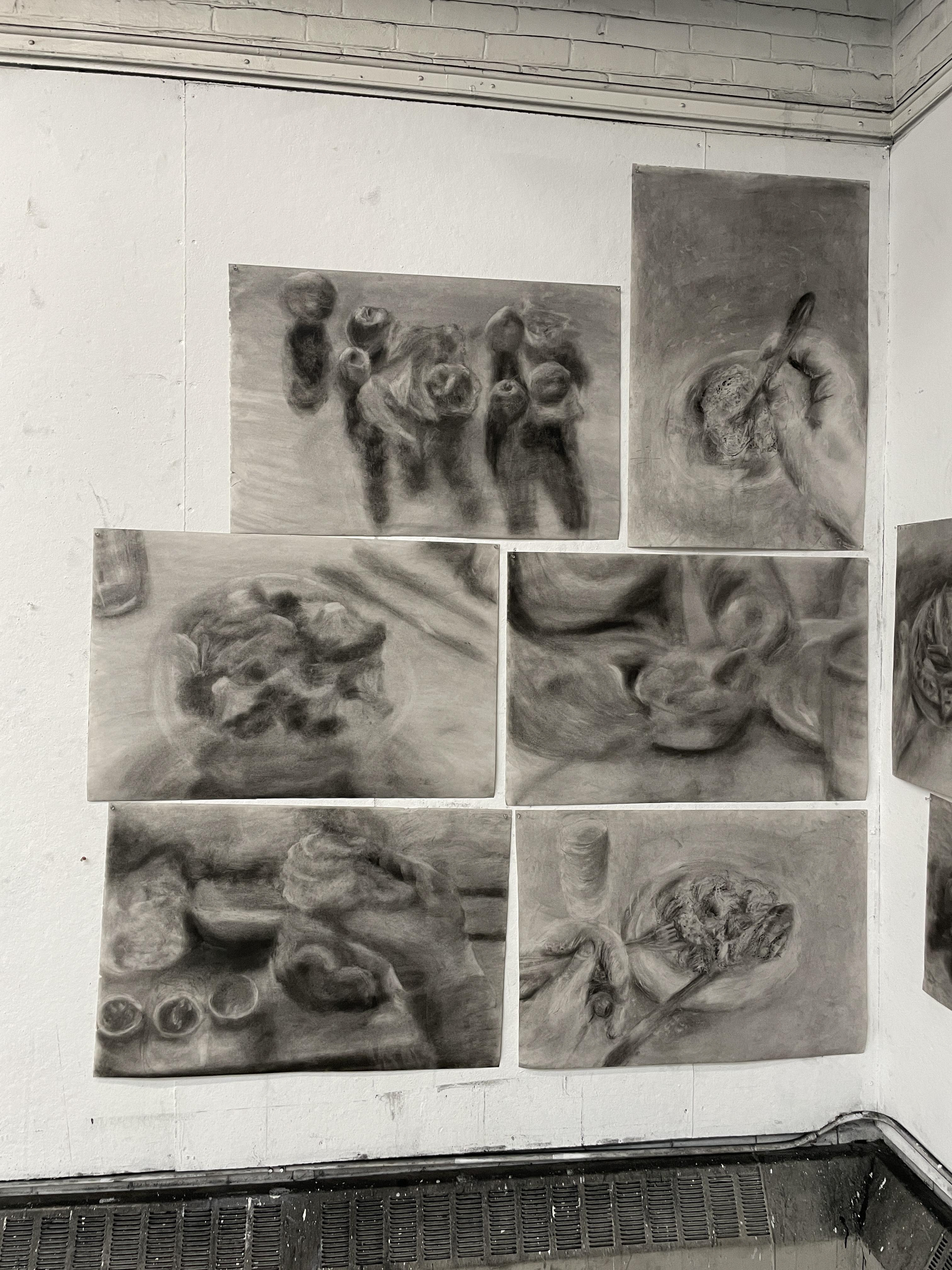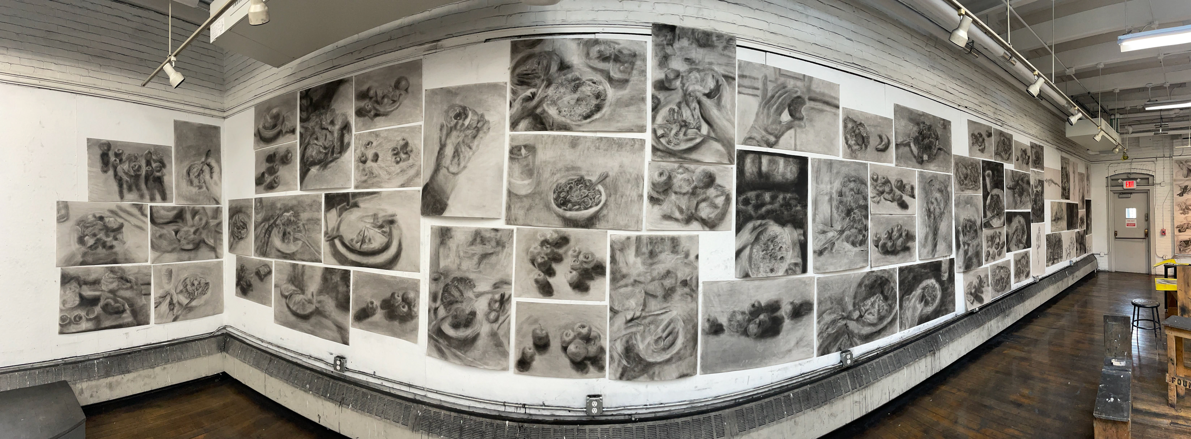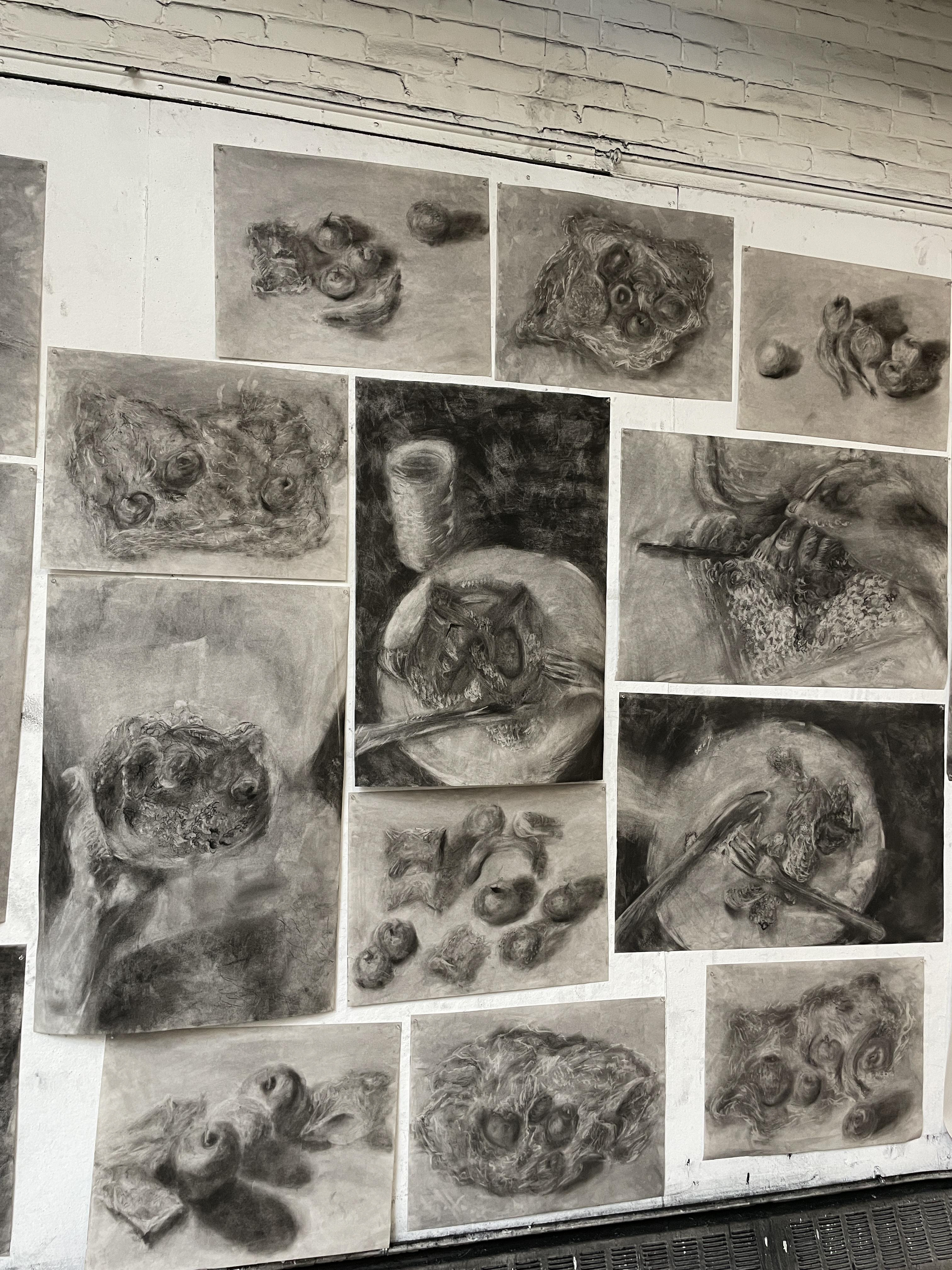 Food is essential to our human existence — and I wanted to explore the qualities that make it so appealing, tasty, yummy, sugary, or dry, gooey, and unsavory — the texture, flavor, and appearance. I wanted to continue challenging myself by combining light and shadow with line in a way that would convey these qualities. With time, I decided to do ever more ambitious and varied selections of food. I also took food to my room to draw in a different environment and was able to control the lighting and shadows of some of the meals I drew, such as many of the apple and fruit selections. One of the challenges I faced was the limits of charcoal, as drawing essentially in grayscale eliminated color, making some of the food ambiguous. To solve this, I chose less ambiguous appearing food or simplified the amount of food in the plate, leading to easier to recognize drawings. In the end, I was able to apply principles I learned in the course, such as variation in light and shadow, form, and the creation of an experience that would elicit feelings — qualities. This exploration made me learn about the diverse types of food and their often weird characteristics.