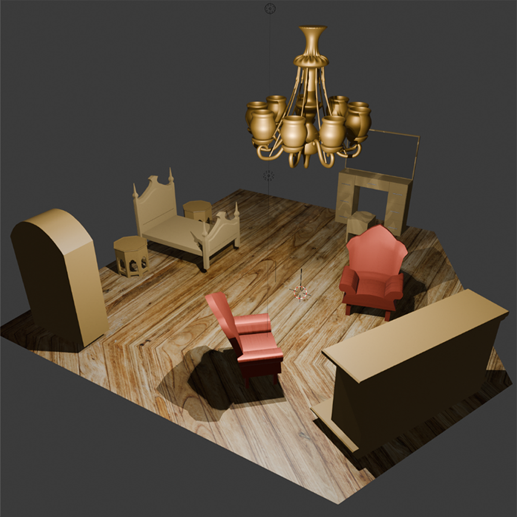 Props were created in Blender/Maya with clean, game-ready topology to match the house's antique aesthetic and run smoothly in Godot.