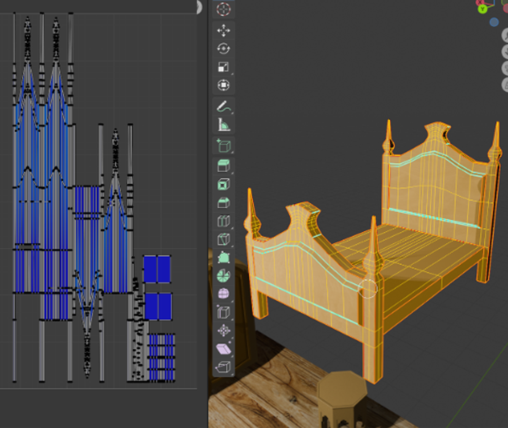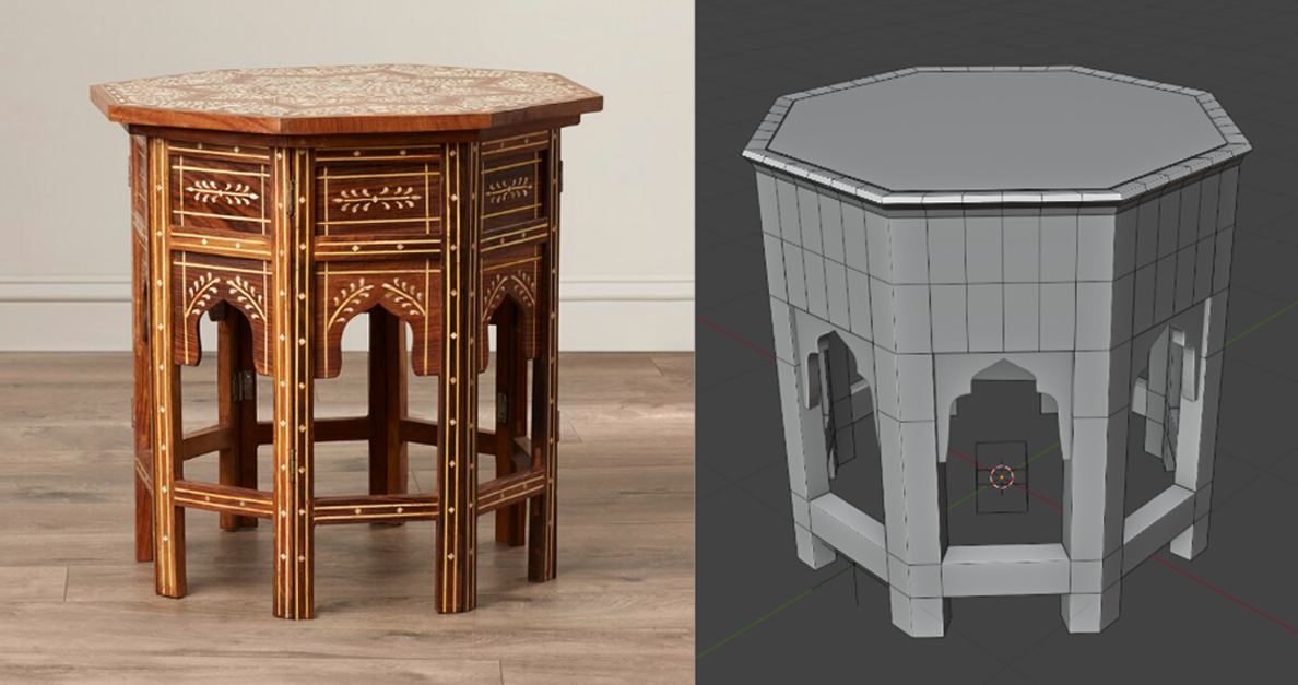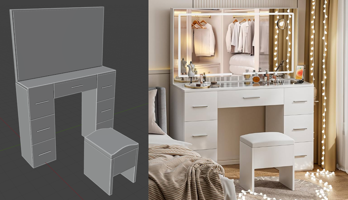 UV-unwrapped 3D models and applied projected image textures for realistic surfaces.