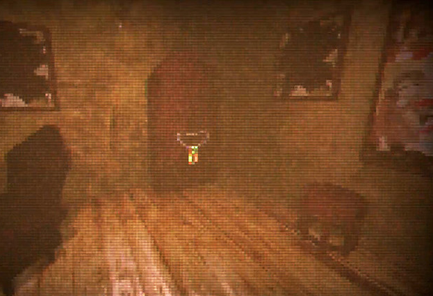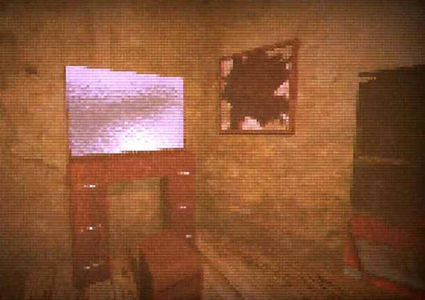 Bedroom Environment: Sepia lighting highlights aged floorboards and a dark wardrobe, contrasting with a glowing mirror against gritty walls.