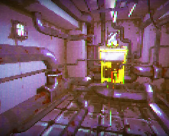 Bathroom Environment: Eerie purple lighting illuminates grimy tiles and industrial pipes, contrasting with a bright, neon-yellow mechanism.