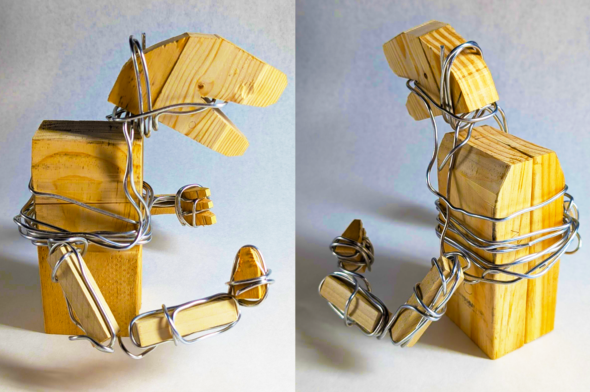A quick lo-fi prototype using wire and wood parts cut with a bandsaw. This provided feedback as to where the servo motors would need to go and how it would all work.